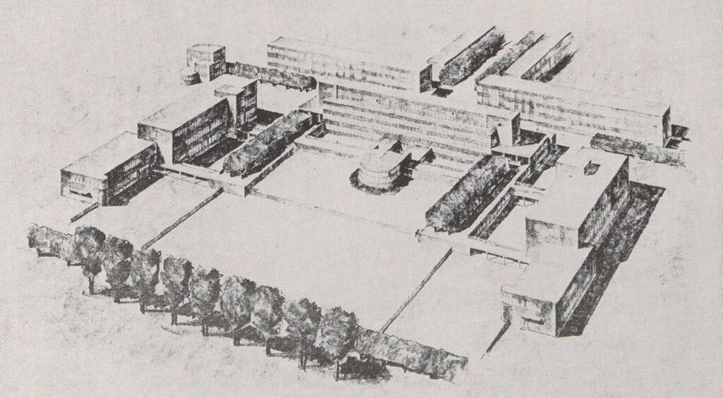 Durch den Verkauf des Geländes der vormaligen Nervenheilanstalt an die IG Farben wurde ein Neubau nötig, für den ME zusammen mit dem Direktor Karl Kleist 1928 ein Raumprogramm und ein erstes Projekt mit Anschluss an die Universitätsklinik in Niederrad entwickelte. Der sternenförmige, durch ein inneres Sechseck verbundene Komplex sollte in einer Verbindung von Pavillon- und Korridorsystem rationalisierte Krankenhaustechnik sowie neueste medizinische und verhaltenstherapeutische Erkenntnisse für die Verwahrung und Behandlung der Patient*innen berücksichtigen. Aus Kostengründen musste ME ein reduziertes Projekt vorlegen, für das er einen symmetrisch-axialen Aufbau wählte. Das neusachliche Flachdachgebäude wurde in Backstein mit weißem „Edelputz“ ausgeführt. Die Flügelbauten mit den Krankenräumen, deren Verbindungsgänge teilweise unterirdisch angeordnet waren, ragten nach Süden in das durch Gartenflächen geprägte Anstaltsgelände. An den Seiten des Haupttrakts, wo die Untersuchungs- und Verwaltungsräume untergebracht waren, traten nach Norden halbrund abgeschlossene Flügel für die Küche und den Hörsaal hervor. Sie waren wie die Hauptfassade teilweise durch grauen „Granatputz“ gekennzeichnet. In das Gebäude integriert war eine auf den Garten gerichtete, halbrund geformte Kapelle. Zum Gesamtkomplex gehörten auch Wohngebäude für die Bediensteten und eine Direktorenvilla. Die seit 1986 denkmalgeschützte Klink wurde 1944 teilweise zerstört, 1956 wieder aufgebaut und harrt seit Jahren einer grundlegenden Sanierung. Im Nachlass befinden sich unter der Bestandsnummer 109 nicht nur Fotos der Nervenklinik – sondern auch welche der dazugehörigen Wohngebäude sowie des Röntgeninstituts und der der Kinderklinik.