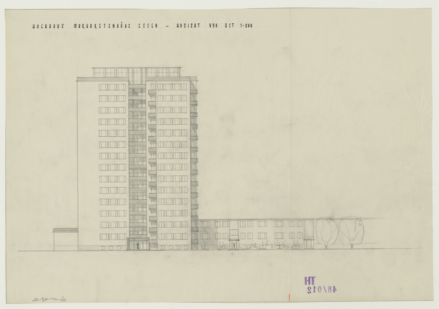 Ende Januar 1954 schuf ME Entwürfe für ein 16geschossiges Hochhaus, das im Bereich der „Neuen“ Margaretenhöhe Lührmann-Straße Ecke Wortbergrode stehen sollte. Dabei nahm er Bezug auf im Februar 1952 entstandene Vorarbeiten des Architekten Schildhauer, die sich im Nachlass befinden. Während Schildhauer pro Geschoss fünf Wohnungen unterschiedlicher Größe aber nur eine Loggia und einen Balkon vorsah, verfügt MEs Entwurf bei gleichen Wohnungsgrundrissen über fünf Balkone, was auch die Fassade lebendiger gemacht hätte. 1956 kam es zu einem Wettbewerb um die Erweiterung der Margarethenhöhe, den Wilhelm Seidensticker mit Entwürfen u. a. für Wohnhochhäuser gewann, die von 1962 bis 1980 realisiert wurden.